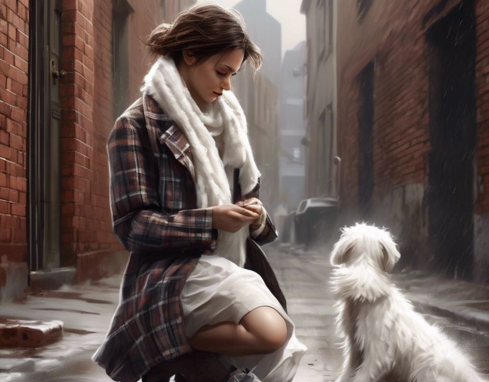 Um cachorro estava no chão, coberto por uma manta velha e suja, encharcada pela chuva que havia atormentado as ruas pouco antes. Seu corpo, quase completamente frio, tinha o pelo branco e molhado — um vira-lata, talvez. A menina acariciou o cão e o colocou em seu colo, manchando sua linda blusa branca enquanto o abraçava com seu casaco. Suas compras estavam espalhadas onde seu show começou, resultado do ato de largar tudo que tinha em mãos antes do grito. Deus! Como um cachorro pode sofrer tanto? Como alguém pode deixar uma criatura sofrer desse jeito? Com os olhos cheios de lágrimas, a menina tirou a cólera do animal e a jogou em um pequeno monte coberto com panos sujos ao lado de onde achou o vira-lata, que já havia percebido. Ora, como não teria percebido, se ouvia a respiração? Mas suas mãos já estavam em uso, e dali partiu.
