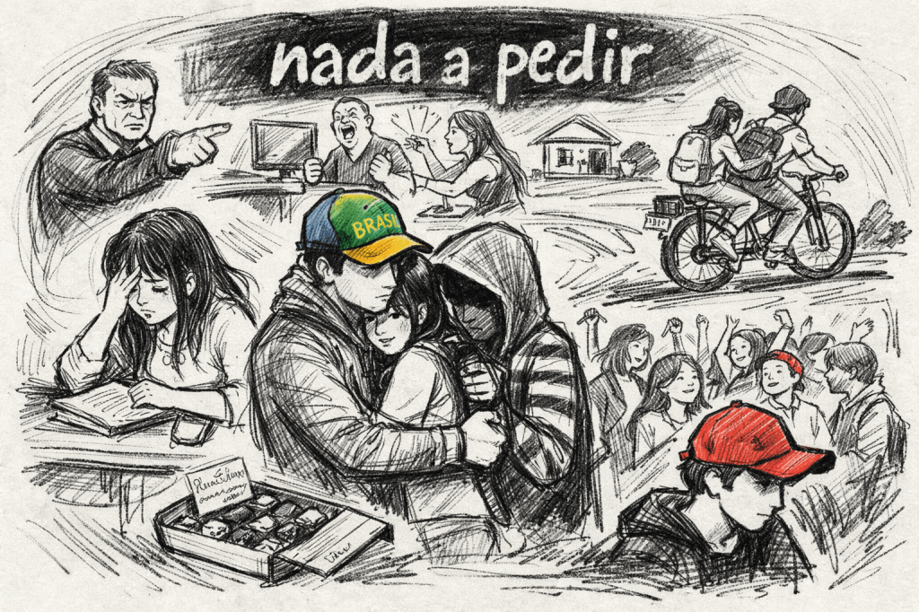 Meu peito dói. Meu queixo treme, mas seguro o choro como quem segura a própria vida. De tanto segurar, começo a murmurar: reclamações do dia — por que meus pais brigam, por que levaram meu celular, por que o menino me chutou — mas nenhuma pergunta alivia o peso no peito.